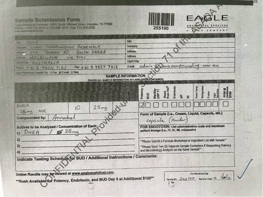 i. The initial email was sent by Nima Alavi to Eagle Analytical Services on 20 January 2012. (Source clause 147 of the CEO Recommendation Show Cause Pack). See ticked items on Como Compounding Pharmacy’s submission form to Eagle on 1/20/2011.