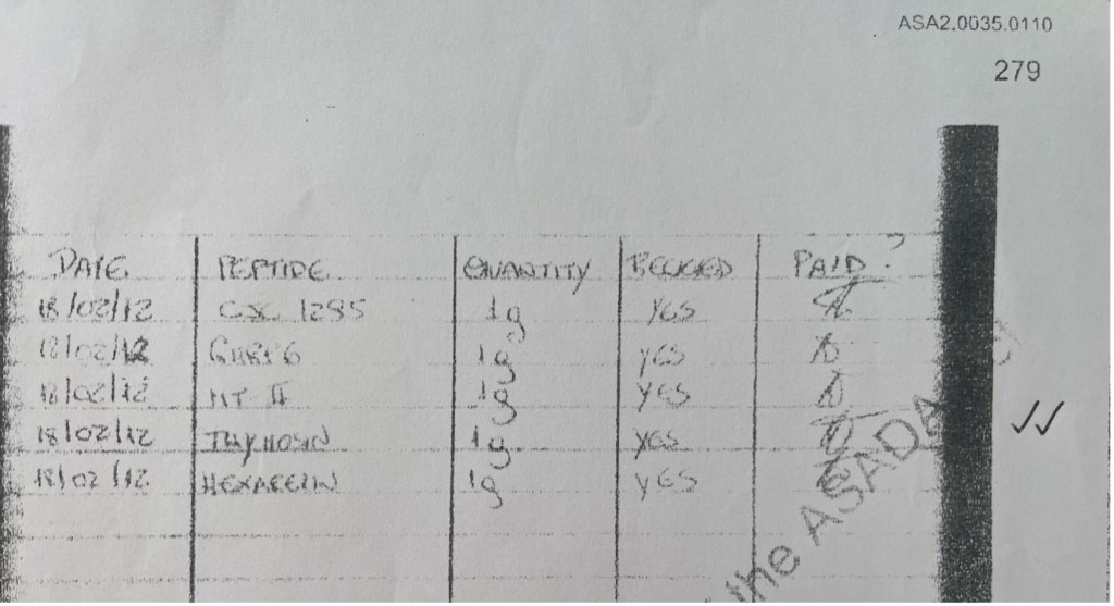 Alavi’s statement authored by Staffer 7 (page 16, clause 121): “On 18 February 2012, my laboratory received one gram of each of the following peptides was received: CJC-1295, Thymosin Beta-4, Hexarelin, GHRP-6 and Melanotan II.”