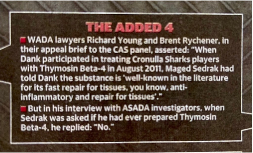 Staffer 7’s Final Investigation Report (page 27 and 28): “Notably, Mr Sedrak advised ASADA that he also had some dealings with Mr Dank in regards to ‘Thymosin Beta’ which Mr Sedrak explained was “a chain of amino acids.