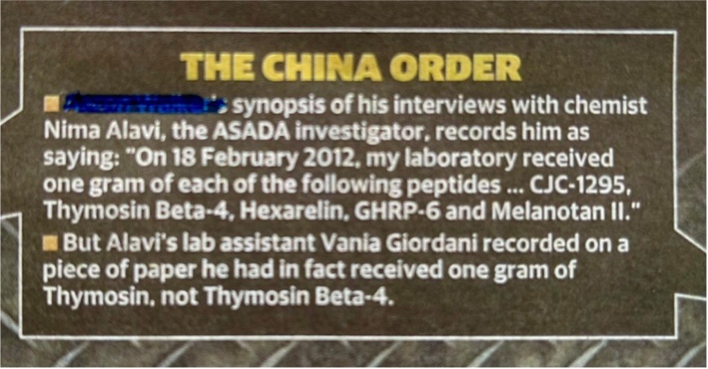 Herald Sun 16 October 2019: Under the heading ‘The China Order’, the Herald Sun said: “Staffer 7’s synopsis of his interviews with chemist Nima Alavi, the ASADA investigator, records him as saying: ‘On 18 February 2012, my laboratory received one gram of each of the following peptides … CJC-1295, THYMOSIN BETA-4 (my emphasis), Hexarelin, GHRP-6 and Melanotan II.’ But Alavi’s lab assistant Vania Giordani recorded on a piece of paper he [Alavi’s Como Compounding Pharmacy] had in fact received one gram of THYMOSIN (my emphasis), not THYMOSIN BETA-4 (my emphasis).”