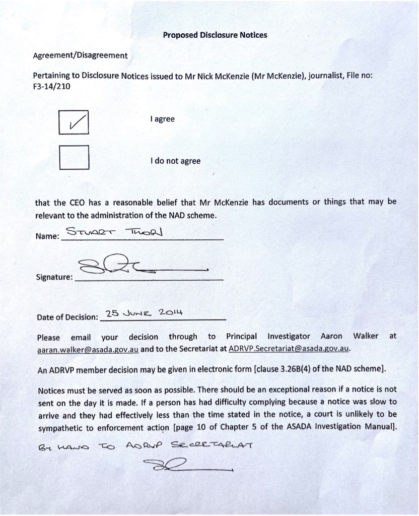 ii. Part 2: Correspondence from the ADRVP that includes three ADRVP members signatures giving permission for the ASADA CEO to issue Disclosure Notices to Eagle Services (Texas USA); Nick McKenzie and Mimotopes.